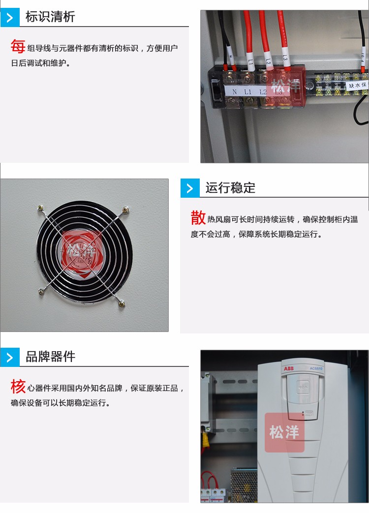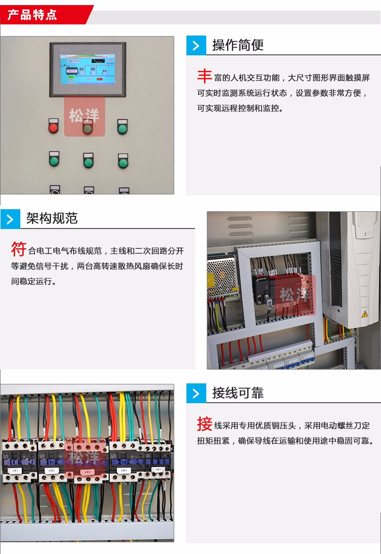 水泵控制柜具有過載、短路、缺相保護以及泵體漏水,電機超溫及漏電等多種保護功能及齊全的狀態(tài)顯示,并具備單泵及多泵控制工作模式,多種主備泵切換方式及各類起動方式??蓮V泛適用于工農(nóng)業(yè)生產(chǎn)及各類建筑的給水、排水、消防、噴淋管網(wǎng)增壓以及暖通空調(diào)冷熱水循環(huán)等多種場合的水泵自動控制。
